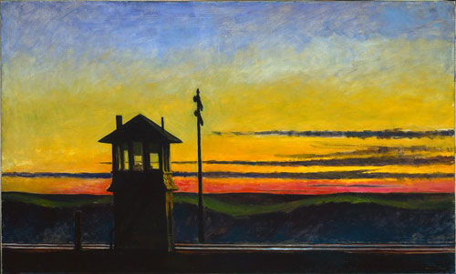 Railroad Sunset. 1929Enquanto o carro segue por uma estrada sinuosa através de bosques ao entardecer, seus faróis fortes iluminam momentaneamente trechos inteiros de prado e de troncos de árvores, e de forma tão intensa que a textura da casca de árvores e os talos separados de capim podem ser discernidos numa luz branca, mais adequada numa enfermaria de hospital que numa região de bosques, e então os mergulham de volta na obscuridade indiscriminada, quando o carro faz uma curva e os faróis voltam sua atenção para outro trecho de terreno sonolento.